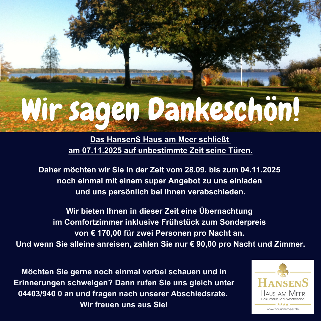 Wir, das HansenS Haus am Meer-Team, verabschiedet sich von all unseren sehr geschätzten und treuen Gästen, Freunden, Geschäftspartnern und Lieferanten des Hauses. Wir haben immer unser Herzblut eingesetzt, um uns allen einen wundervollen Aufenthalt und eine erfolgreiche Zusammenarbeit zu garantieren. Und dies im Team zu diesem Zeitpunkt und auch weiter bis zu unserer Schließung.